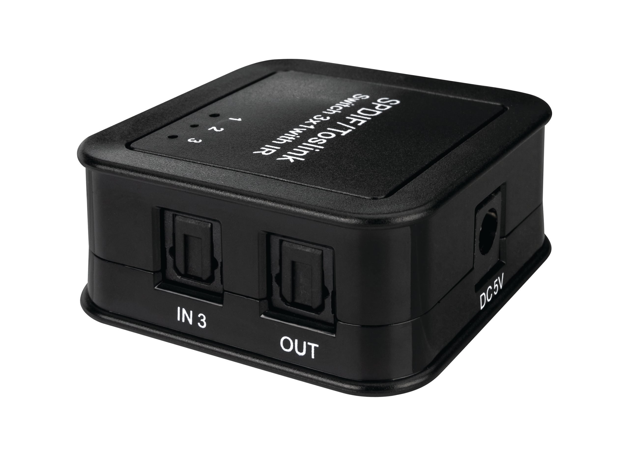 - Three digital optical audio input signals switch to one digital optical audio output
