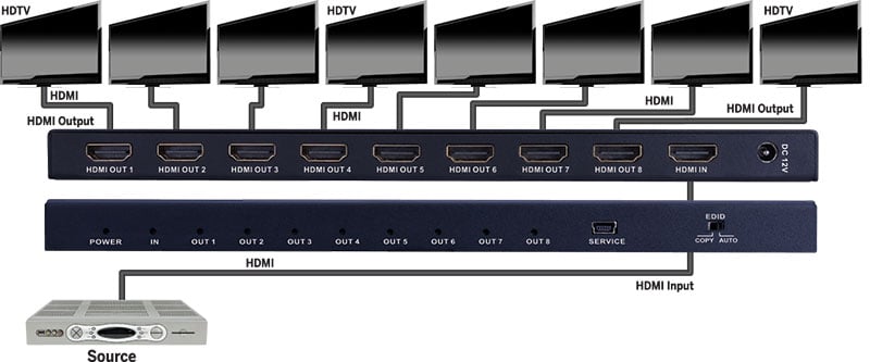 - Transmits audio and video from a single source to 8 HDMI outputs up to 4K2K (2160p) Ultra High Definition resolution without any loss of quality or resolution