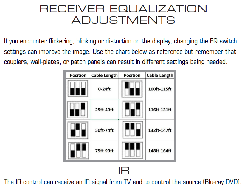 - EQ settings on the receiver allows for easy adjustment based on cabeling distance